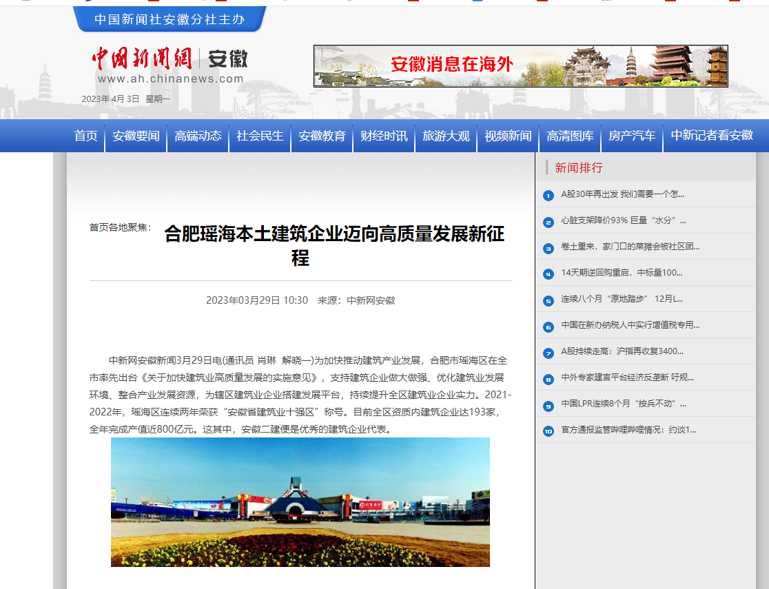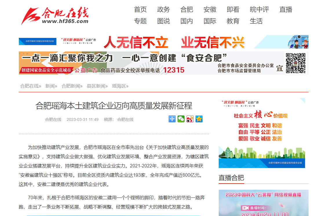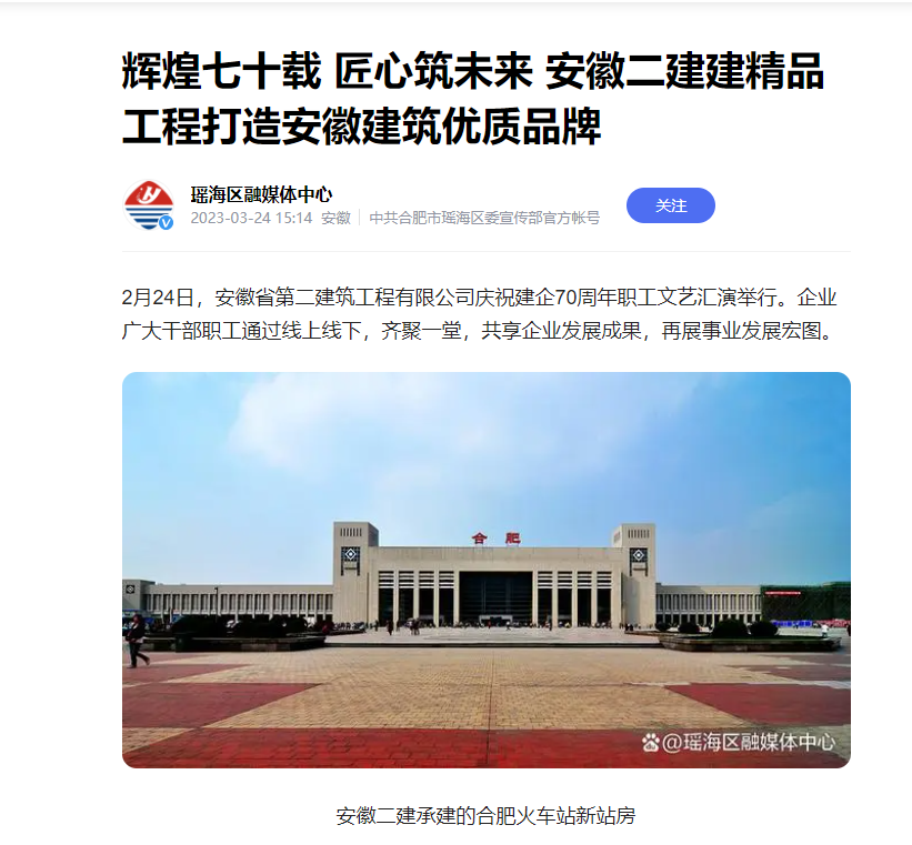 近日,新華網安徽頻道、中國商報網、中新網安徽頻道、市場星報、合肥在線、今日頭條-瑤海宣傳、瑤海區融媒體中心、金臺資訊、網易新聞、搜狐新聞、騰訊網、大公網等多家平臺媒體相繼報道安徽二建公司70周年發展成就。