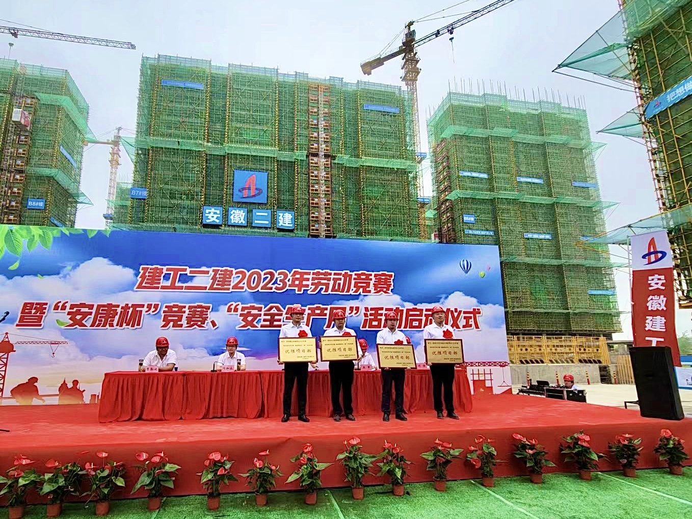 5月30日上午,建工二建在蕪湖中丞濱江時代項目現(xiàn)場舉行2023年勞動競賽暨“安康杯”競賽、“安全生產(chǎn)月”活動啟動儀式。公司領(lǐng)導(dǎo)班子成員,勞動競賽委員會成員,所屬各單位主要領(lǐng)導(dǎo),分管安全、生產(chǎn)及質(zhì)量副經(jīng)理,工會(副)主席,工管科、安全科科長,公司工會、工程管理部、安全管理部、技術(shù)質(zhì)量部相關(guān)人員,受表彰先進集體和個人代表等共百余人參加本次活動,公司黨委副書記、工會主席王軍主持啟動儀式。