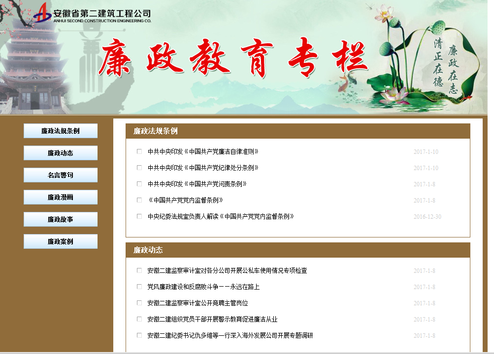 該專欄以公司網(wǎng)站為依托,設(shè)有廉政法規(guī)條例、廉政動態(tài)、名言警句、廉政漫畫、廉政故事、廉政案例六大板塊。通過廉政法規(guī)條例,轉(zhuǎn)載《中國共產(chǎn)黨廉潔自律準則》、《中國共產(chǎn)黨紀律處分條例》、《中國共產(chǎn)黨問責(zé)條例》、《安徽省預(yù)防職務(wù)犯罪條例》等一系列黨紀黨規(guī)、國家法律法規(guī)知識,并在每一次修訂后及時更新,為廣大黨員干部學(xué)習(xí)使用提供方便。運用廉政動態(tài),及時發(fā)布集團紀委和公司黨委、紀委通知要求,通報監(jiān)察審計事項與結(jié)果,做到監(jiān)督的公開化、透明化。以名言警句、廉政漫畫、廉政故事、廉政案例感染人、陶冶人,內(nèi)容直觀形象,用勤廉典型激勵人,深入剖析典型違紀案例,加強警示教育。