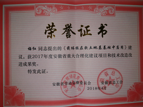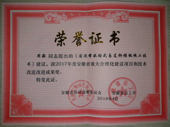 在日前召開的安徽省慶祝“五一”暨“當好主人翁、建功新時代”勞動競賽推進大會上,對獲得榮譽稱號的先進集體和先進個人進行了表彰頒獎。我公司技術(shù)質(zhì)量部主任周毅提出的《后澆帶承插式易支拆模板施工技術(shù)》和副主任梅紅提出的《載體樁在軟土地基基礎(chǔ)中應用》建議,雙雙榮獲2017年度安徽省重大合理化建議項目和技術(shù)改造改進成果獎。