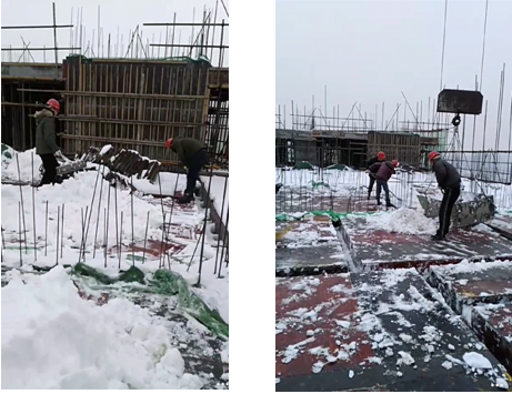 隨著“大干60天生產競賽”的圓滿結束,宿州市于元月4日迎來了第一場大范圍強降雪。持續(xù)了兩天的大雪使整個宿州籠罩在一片白色之中,道路全部被阻斷,現場施工也一度停滯。為做好極端天氣下建筑施工的安全生產工作,一方面項目部緊急成立應急小組,對暴雪造成的安全隱患進行全面排查,尤其對生活區(qū)、樓層外架、現場臨時用電、起重設備等進行專項檢查,及時清理積雪、消除隱患;另一方面為保證雪后施工的正常開展,項目部動員管理人員對樓頂現澆面的積雪進行清理,為下一步的安全生產提供及時的工作面。