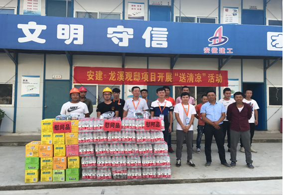 炎炎夏日高溫?zé)o情,絲絲涼意公司有愛。自7月以來,氣溫持續(xù)升高,為應(yīng)對(duì)高溫酷暑天氣龍溪觀邸項(xiàng)目部積極采取有效措施,及時(shí)開展夏季“送清涼”慰問活動(dòng),充分體現(xiàn)了項(xiàng)目部對(duì)廣大參建員工和農(nóng)民工的關(guān)愛。